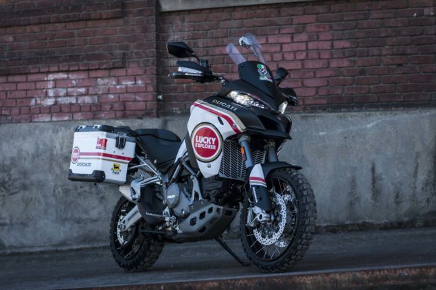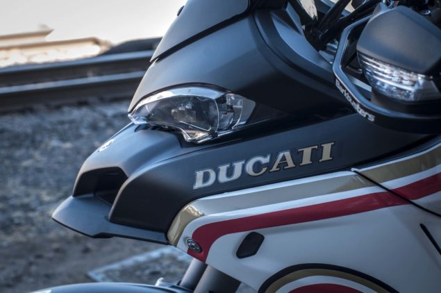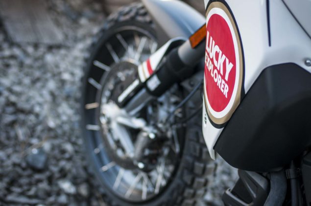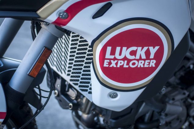 Primarily a visual exercise, the “Lucky Explorer” features a few bits and bobs from the Ducati Performance catalog, and what is available in the aftermarket for the Ducati Multistrada 1200 Enduro. Of note are the period-specific decals for Agip fluids, Michelin tires, and the Cagiva brand (check the windshield).