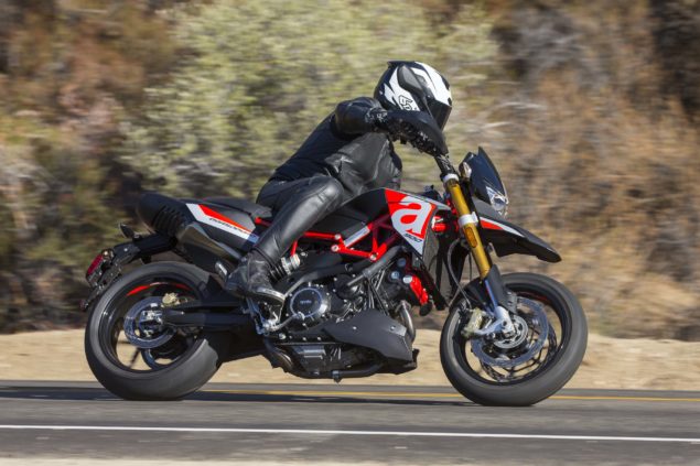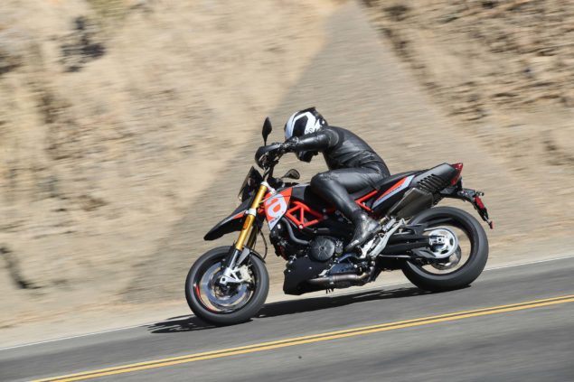 Despite its supermoto looks, the Aprilia Dorsoduro 900 is easy to flat-foot at a stop sign (despite what the 34″ seat height suggests), and the bike doesn’t feel overly top-heavy. Believe it or not, the seat is quite comfortable too.