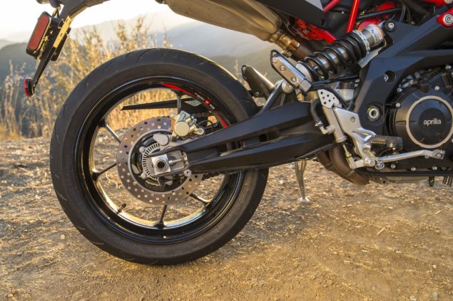 Aprilia touts some smart internal engine changes for the 900cc design, namely a new crank with a longer stroke and revised balancing. A new piston coating has also been used for less friction, as well as a reinforced piston pin. The piston design has also been lightened.